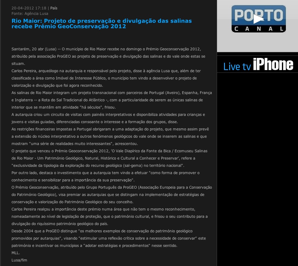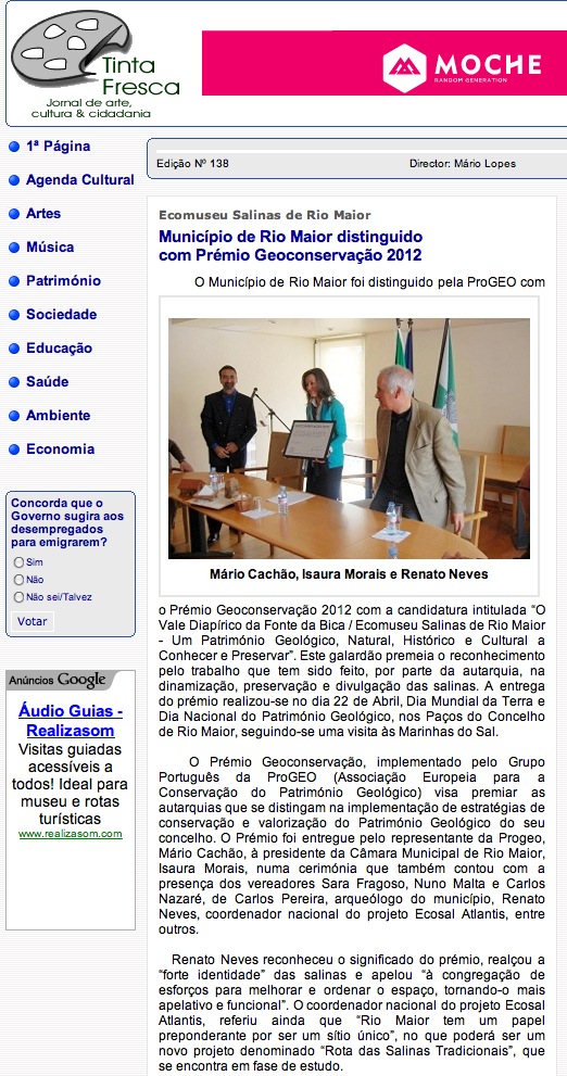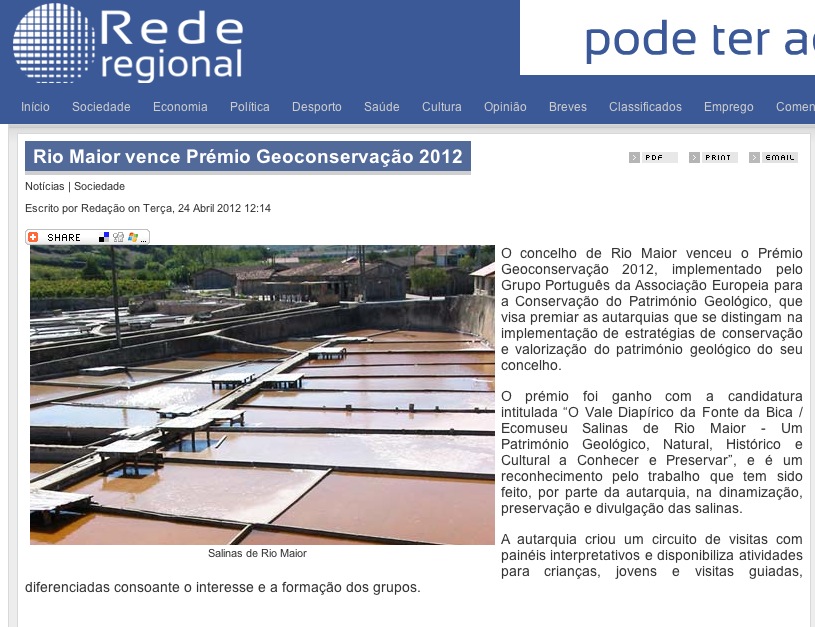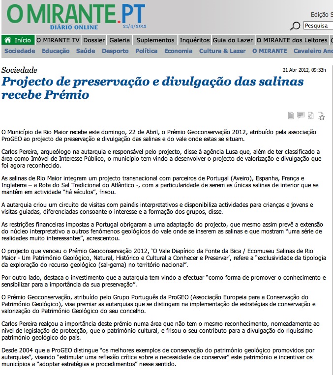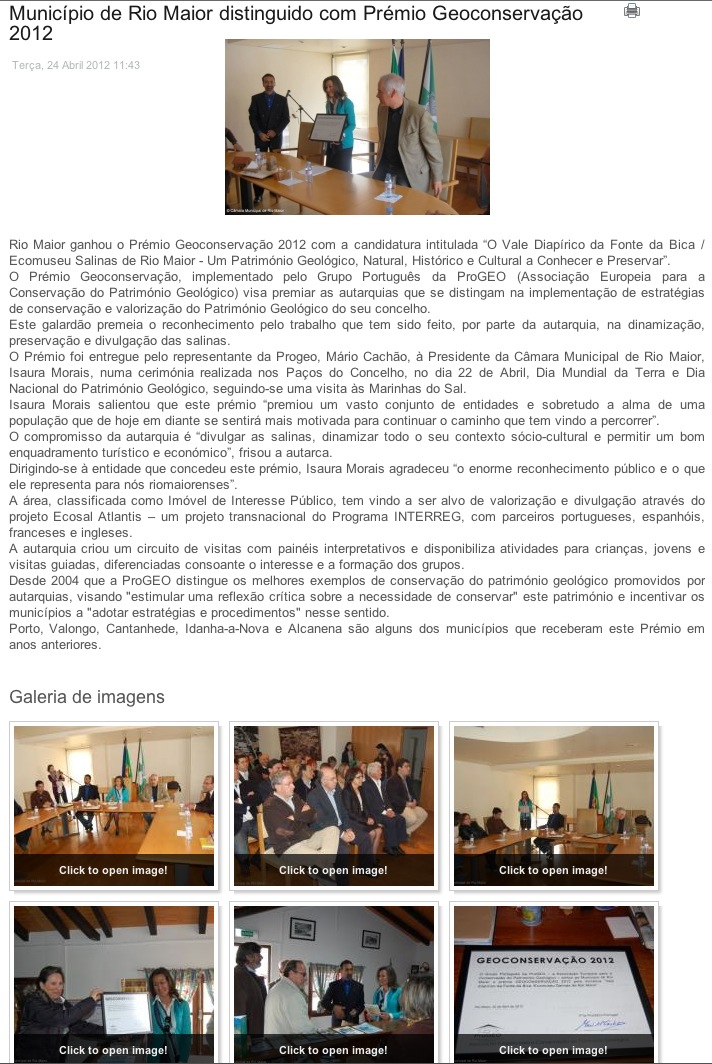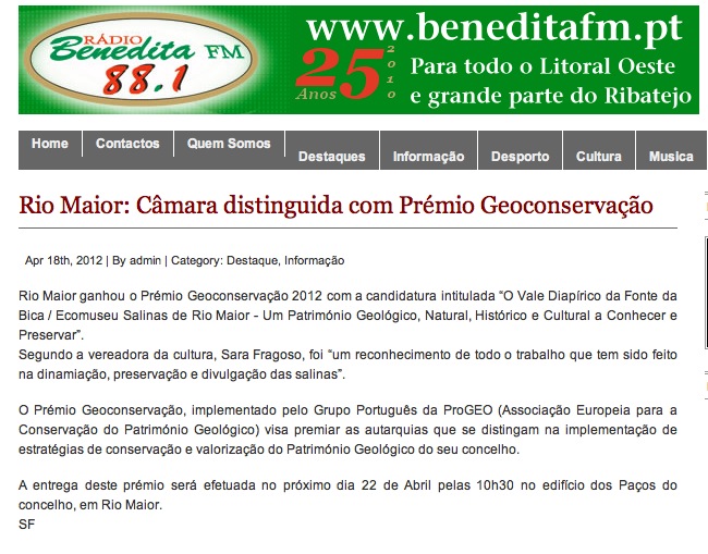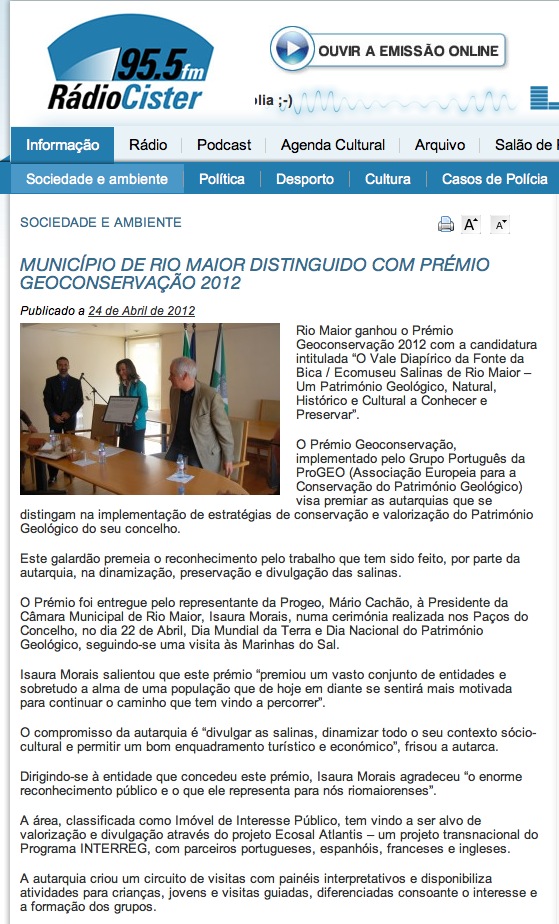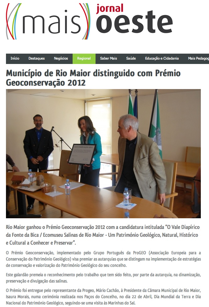 "...o Júri reconheceu o trabalho desenvolvido destacou o facto da autarquia ter classificado a área como Imóvel de Interesse Público e de ter desenvolvido um museu onde se promovem ações de carácter educativo e turístico"